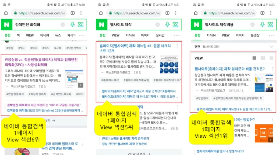 위 이미지에서 보신 것 처럼 저희 비즈니스 키워드인 "검색엔진 최적화", "웹사이트 제작", "웹사이트 제작비용" 3개의 키워드가 네이버 통합검색에 노출되어 있습니다.