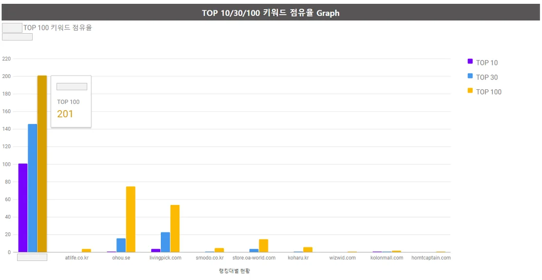 앞서 추출한 핵심연관 키워드로 경쟁사와 비교 하여 구글/네이버의 키워드 점유률과 현재 Position을 알아낼 수 있습니다.