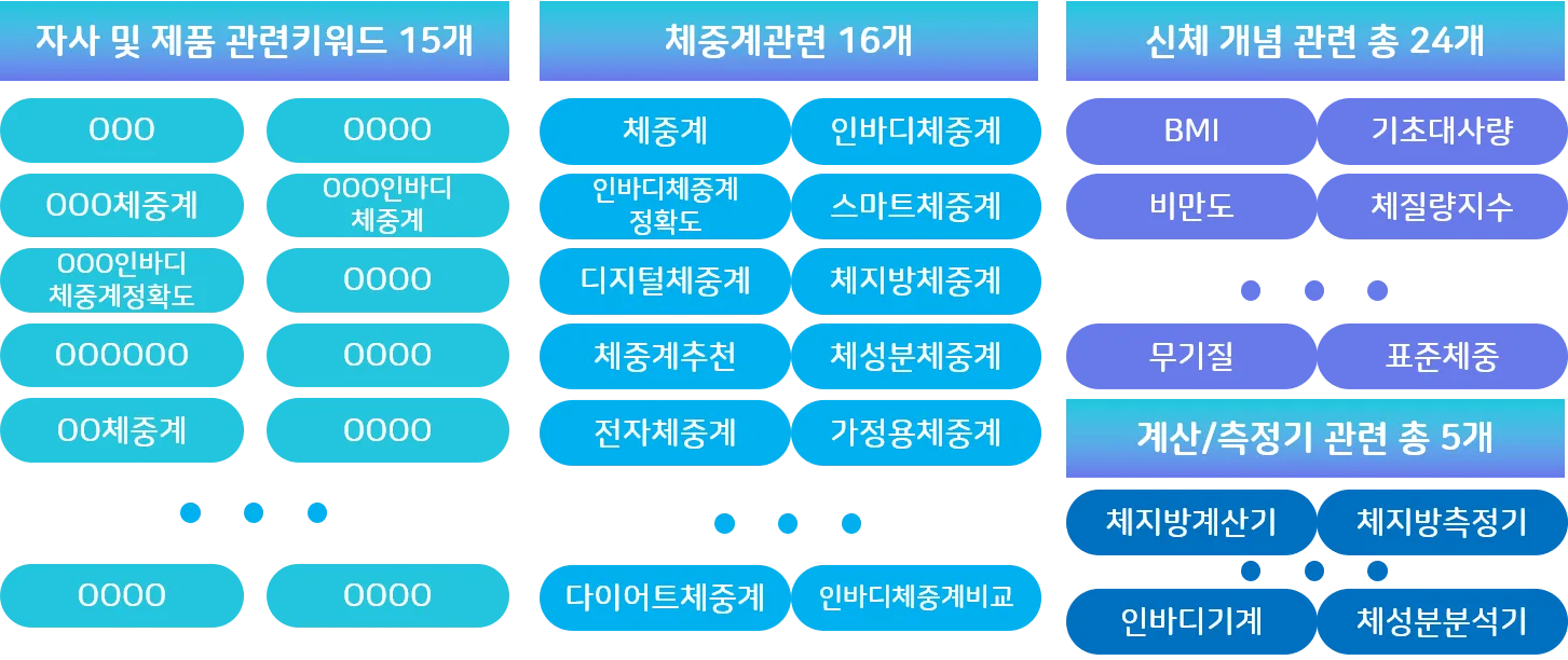 자사 및 제품관련키워드, 제품 일반키워드, 개념키워드 등 다양한 키워드의 그룹핑을 통해서 타겟팅할 키워드를 일목요연하게 정리합니다.