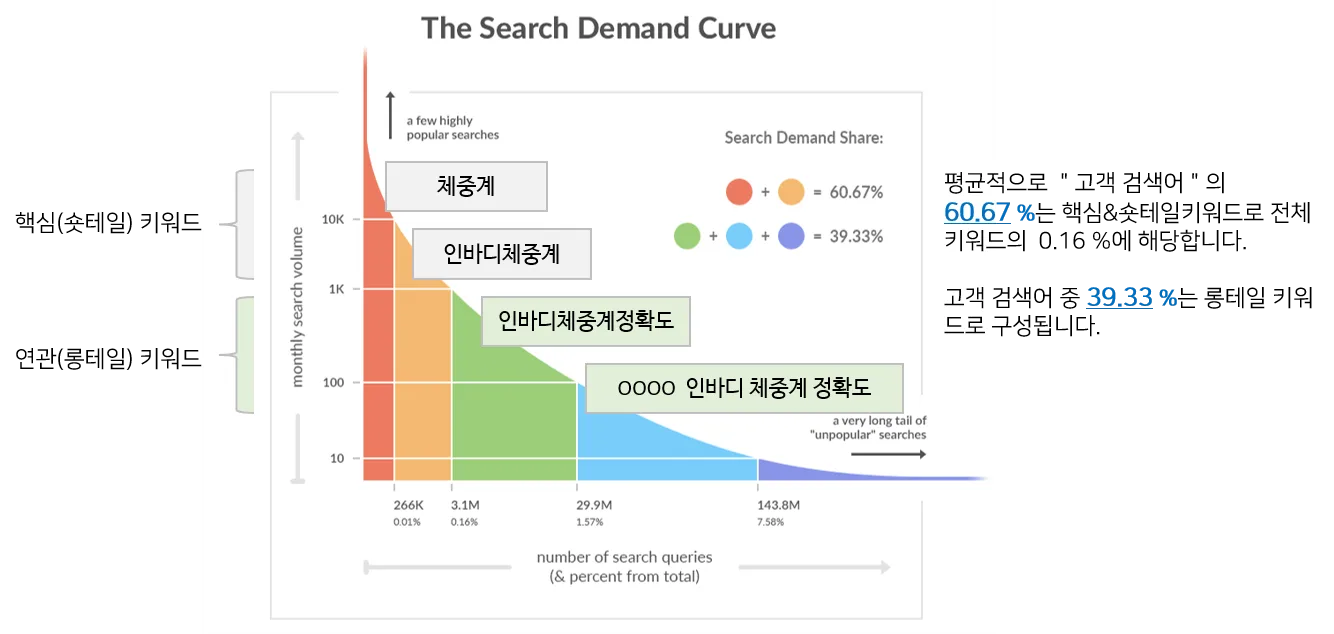 롱테일 키워드는 검색량은 낮지만 구체적이고 길게 구성된 키워드로, 전환율이 매우 높은 편입니다.