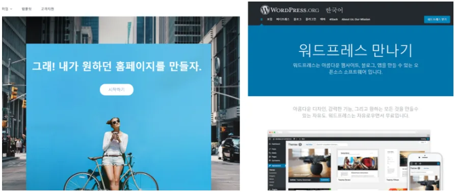 워드프레스와 윅스가 있습니다. 두 도구 모두 다양한 플러그인이 많아서 다양한 기능을 제공합니다. 광고에서는 매우 쉽다는 것을 강조하는데요. 실제로 해보시면 이미지 교체나 텍스트 수정이 매우 간단하고 최신 기능이 많지만 내가 원하는 웹사이트 또는 서비스를 만드는 데에는 한계가 있습니다. 물론 가격대가 매우 저렴해서 무료로 제공하는 곳도 있으니 처음 웹사이트를 제작하시려는 분께는 좋다고 생각합니다. 다만, 운영을 하시다 보면 한계를 느낄 수 밖에 없는 것이 자동화 도구의 단점입니다. 디지털을 전혀 모르는 분이 자동화 툴을 통해 자기가 원하는 퀄리티의 페이지를 만든다는 것은 html, css, javascript 등 많은 공부를 해야 한다는 것입니다. 그리고 자동화 툴은 대부분 외산이라 디자인이나 레이아웃이 국내 정서에 맞지 않거나 사용 툴의 메뉴명 등이 매우 어렵다는 단점이 있습니다.