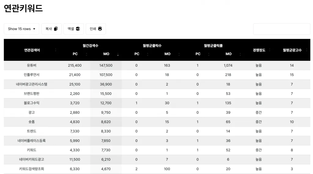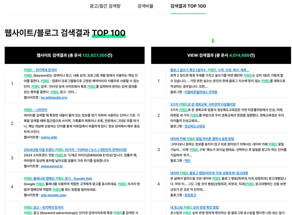 네이버 광고센터 키워드 도구와 네이버 검색 api를 연결해서 키워드 검색량과 연관키워드, 키워드 추이현황, 웹&블로그 검색결과 TOP 100을 무료로 볼 수 있습니다. 국내에는 블랙키위 같은 도구가 유명하지만 중요 정보를 보려고 하면 유료 서비스로 제공합니다. 제한 없는 네이버 키워드 도구를 찾으신다면 워드키가 좋습니다.